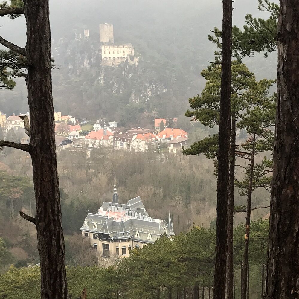 Vorbei am Kirchlein St.Helena hinauf zur Ruine Rauhenstein (gesperrt). Weiter über die Aussichtspunkte Jammerwandl und Urtelstein zur Siegenfelder Kreuzung. Von hier blau markiert auf den Schwarzberg mit seiner prächtigen Aussicht auf den Hohen Lindkogel. Auf Forstwegen hinüber zum Kleespitzsattel, von dem wir zur Cholerakapelle absteigen (Einkehrmöglichkeit, Bushaltestelle).