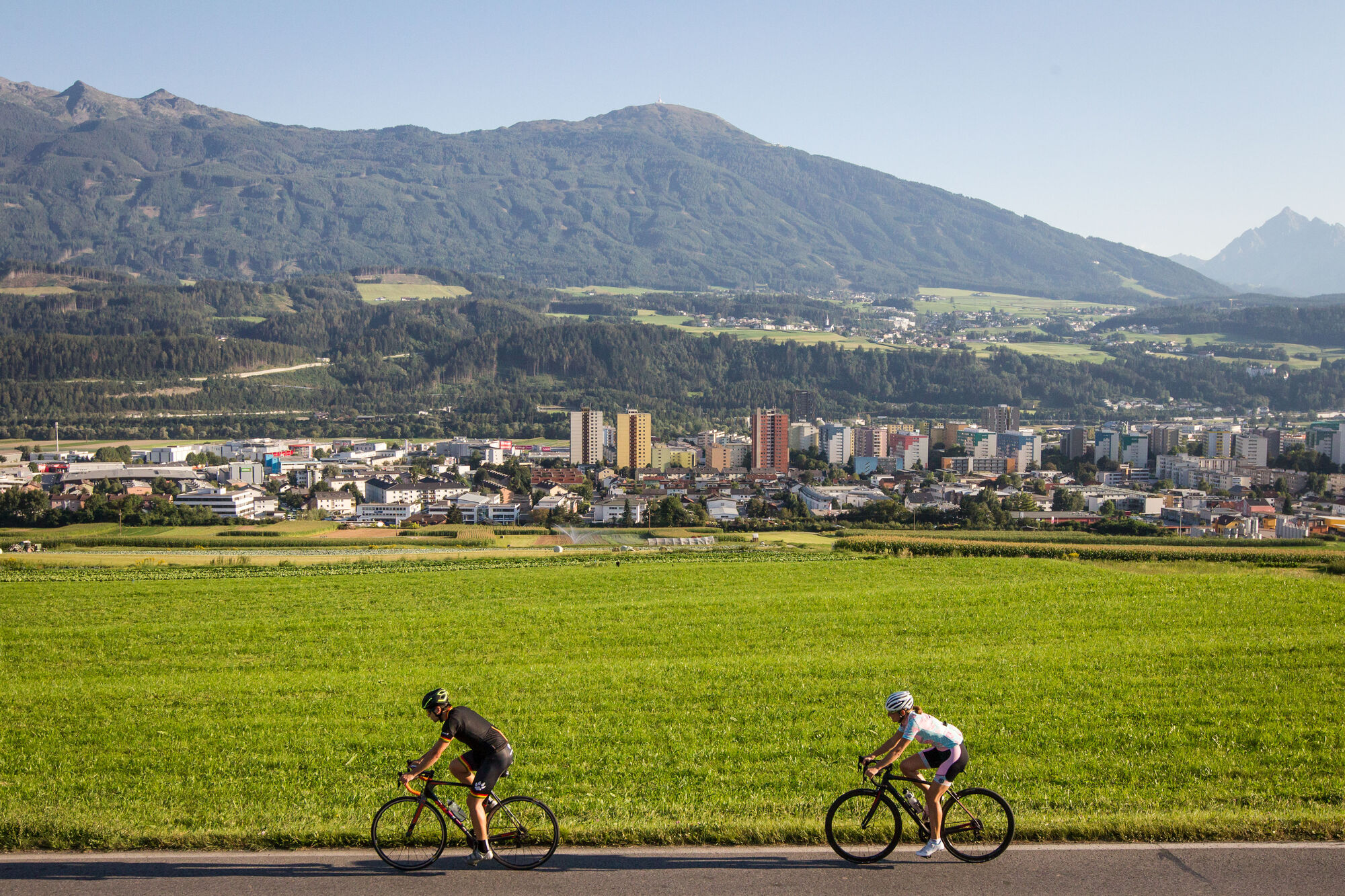 Von Rum geht es stetig bergauf in Richtung Gnadenwald, einer idyllischen Hochebene mit herrlichen Ausblicken auf das Karwendelgebirge. Nach dem höchsten Punkt der Strecke folgt eine rasante Abfahrt hinunter nach Terfens, wo sich eine kurze Erholungsphase auf flachen Straßen bietet.