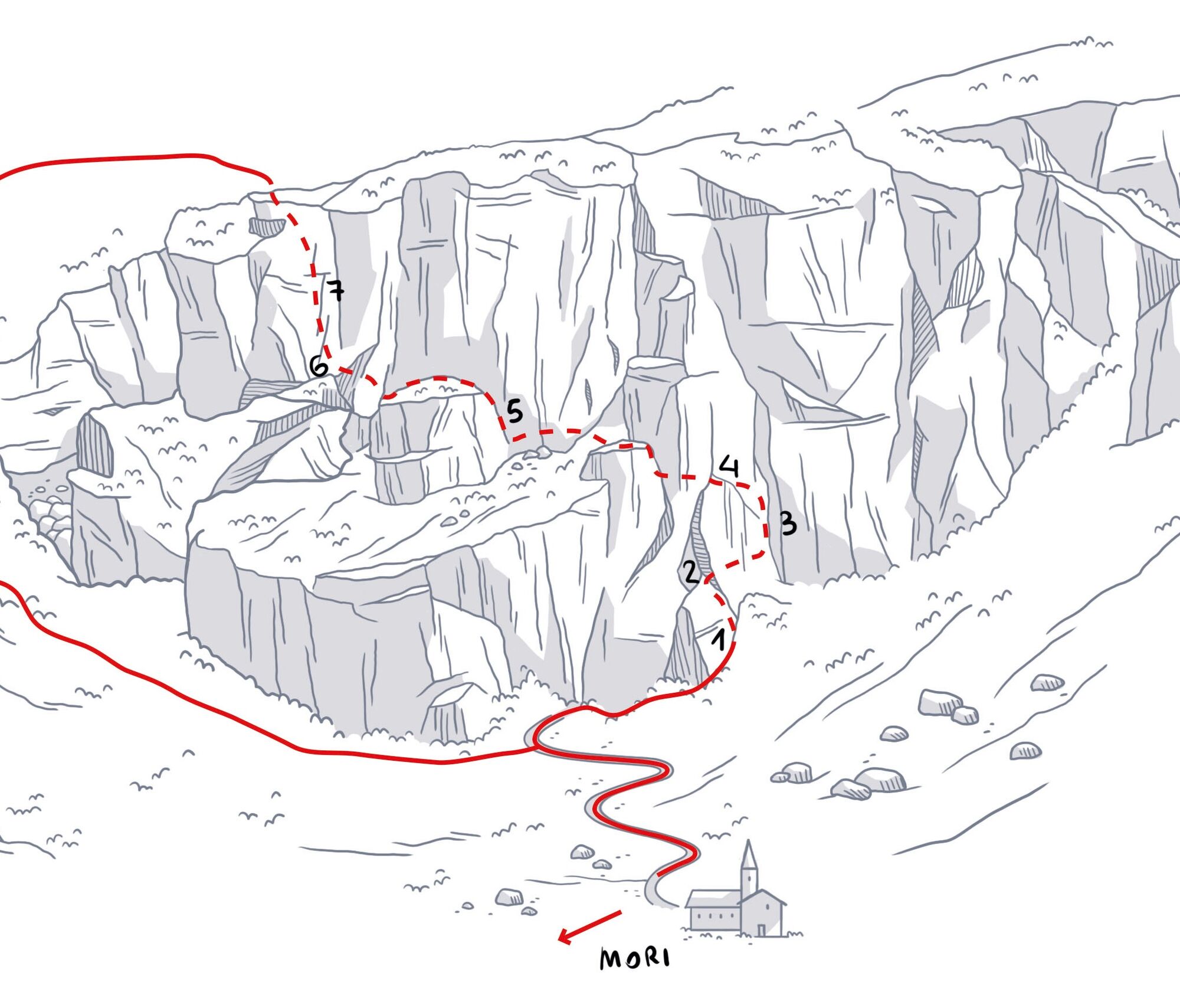 From the centre of Mori head uphill towards the sanctuary from which a short trail takes you to the start of the via ferrata (put on your helmet before you approach the rock wall – this is an area where stones may fall dislodged by people above you on the ferrata).